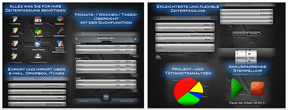 Die App ist gut gestaltet und bietet zahlreiche Möglichkeiten, Projekte und Arbeitsbereiche oder Kunden und Arbeitspakete festzulegen und zu bepreisen. So kann man jedem Arbeitspaket einen eigenen Stundenpreis zuweisen und sogar Überstunden mit Extrakosten erfassen. Für alle Eintragungen nutzt man die Funktion „Stempeluhr“. Da tippt man einfach zu Beginn der Arbeit drauf und zum Ende nochmal. Wenn man eine Pause macht, kann man sich auch abmelden. Schon ist die Arbeitszeit erfasst. Wenn man auf Stop tippt, kann man die Projektdaten auswählen, also zum Beispiel Kunde Müller, Datenbankaktualisierung.