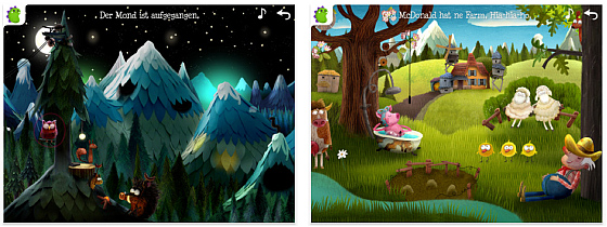 Die App bietet zurzeit drei beliebte Kinderlieder: „Der Mond ist aufgegangen“, „Old McDonald hat ’ne Farm“ und „Londons Brücke hat ein Loch“. Mit der Karaoke-Funktion können die Kleinen gut die Lieder mitsingen.