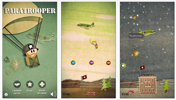Ein Paratrooper ist ein Fallschirmspringer. Für den ist es lebenswichtig, da zu landen, wo er landen möchte. Dächer, Bäume und andere Hindernisse sind die natürlichen Feinde des Fallschirmspringers. In dem noch recht neuen Spiel Paratrooper von Kaboom Industries für iPhone, iPod Touch und iPad geht es nun darum, Fallschirmspringer möglichst treffsicher landen zu lassen. Dafür fliegen Flugzeuge über den Bildschirm, aus denen die Fallschirmspringer abspringen, wenn Du auf das Flugzeug tippst.