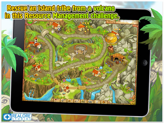 Auf dem größeren Display des iPad kommt das Spiel besser zur Geltung. Der Spielinhalt: Löse in der vorgegebenen Zeit die Aufgaben und rette den Volksstamm vor dem drohenden Vulkanausbruch