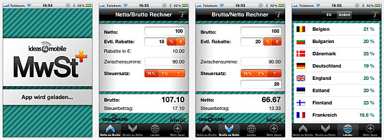 Das Tool funktioniert in beide Richtungen: Du kannst auf den Nettobetrag die Umsatzsteuer addieren, oder vom Bruttobetrag die Umsatzsteuer runterrechnen. Natürlich bietet die App 7 und 19 Prozent Umsatzsteuer und hat darüber hinaus auch die Möglichkeit, jeden anderen Prozentwert einzugeben, so dass man auch gut Rabatte damit berechnen oder weitere Prozentrechnungen damit machen kann.