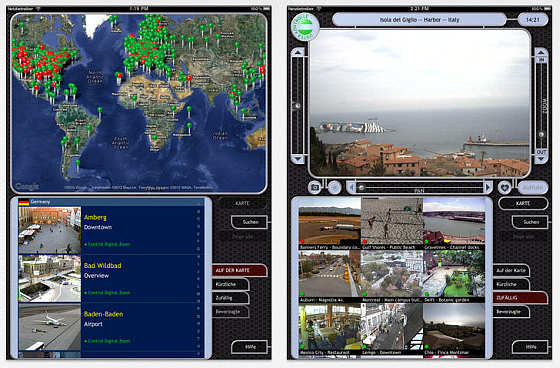 Ich weiß ja nicht, ob das schon Standard überall ist, mich hat es jedenfalls überrascht: Die iPad-App Cam On! HD, die gerade statt für 1,79 Euro kostenlos angeboten wird, bietet nicht nur tausende Webcams in Deutschland und International, mit der App kannst Du die Webcams auch steuern. Du kannst heranzoomen und schwenken und so per Webcam das jeweilige Areal erforschen.