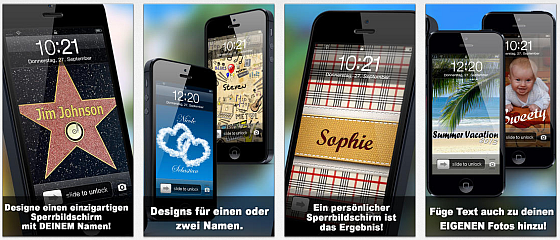 Mit Pimp your name erstellst Du einfach einen persönlichen Sperrbildschirm für Dein iPhone oder Deinen iPod Touch. 100 Vorlagen sind dabei, Du kannst aber auch eigene Bilder als Basis nehmen.