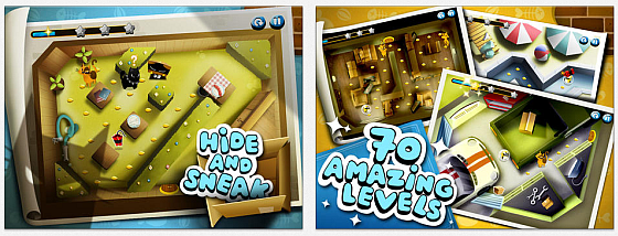 Die ersten Einführungslevel sind – wie erwartet – sehr einfach, doch dann nimmt der Schwierigkeitsgrad ordentlich zu. Du bekommst zwar auch Hilfen, wie Kartons, in denen Du Dich verstecken kannst oder Sprengstoff, um die Katze gleich mal für einige Sekunden außer Gefecht zu setzen, aber auch die Katzen werden schlauer und das in den ersten Leveln noch mögliche Hinterherschleichen funktioniert dann nicht mehr so einfach. Zudem gibt es auch unterschiedliche Katzentypen, die Deinen Levelabschluß verhindern wollen.