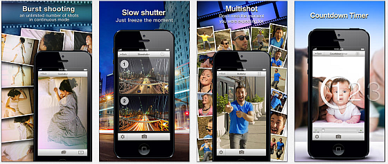 So kann man lange Belichtungszeiten wählen (hierfür muss das Gerät natürlich verwacklungsfrei stehen), man kann Bilderserien erstellen und einen Countdown festlegen, nach dessen Ende eine Aufnahme gemacht wird. Zusätzlich bringt die App 54 verschiedene Effekte mit.