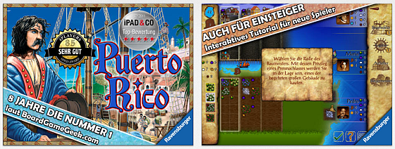 Ravensburger hat die Spiele Puerto Rico HD (für das iPad) und San Juan (iPhone und iPod Touch / iPad) von jeweils 5,99 Euro auf 89 Cent reduziert.
