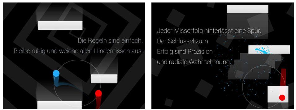 In Duet Game von Kumobius ist es Deine Aufgabe, mit zwei in einem Kreis miteinander verbundenen Gefäßen (Punkten) herabfahrenden geometrischen Objekten auszuweichen. Mit dem Daumen auf dem Display drehst Du die verbundenen Punkte aus der Gefahrenzone. Das braucht etwas Übung – zumindest bei mir endeten die Versuche immer zu früh. Immer nur einen Daumen zur Zeit…