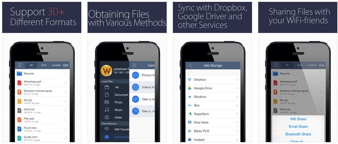 Du kannst Dateien per Email,WLAN, iTunes File Sharing, dem eingebauten Browser, Dropbox, Box, SkyDrive, Google Drive und SugarSync importieren. Dateien können in Ordnern abgelegt werden, Du kannst sie kopieren, umbenennen, zippen und öffnen.