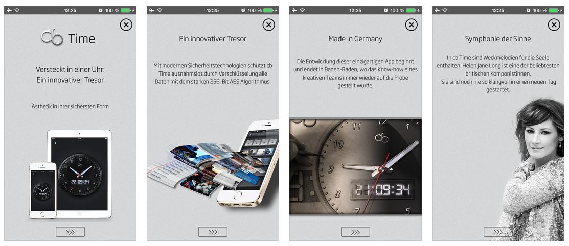 cb Time – Hochsicherer Tresor versteckt in einer Uhr läuft auf iPhone, iPod Touch und iPad mit iOS 7.0 oder neuer. Die App beherrscht sechs Sprachen (kann man unter Einstellungen in der App auswählen) und braucht (ohne abgelegte Dateien) 18 MB. Der Normalpreis beträgt 3,99 Euro.
